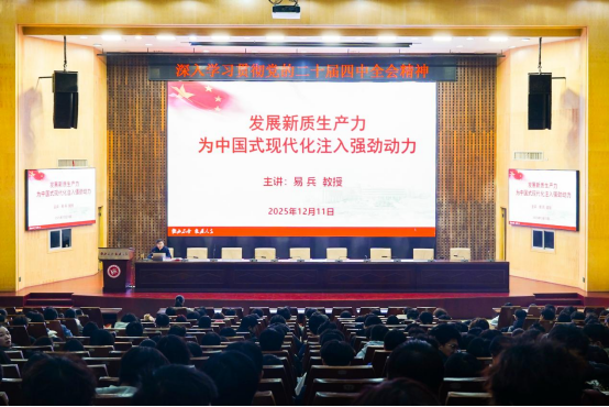 为深入学习贯彻党的二十届四中全会精神,持续推动党的创新理论武装走深走实,12月11日下午,党委副书记、校长易兵以《发展新质生产力为中国式现代化注入强劲动力》为题为应用化学、电子信息、国际贸易等专业近400名学生讲授了一堂生动而深刻的党的二十届四中全会精神专题思政课。