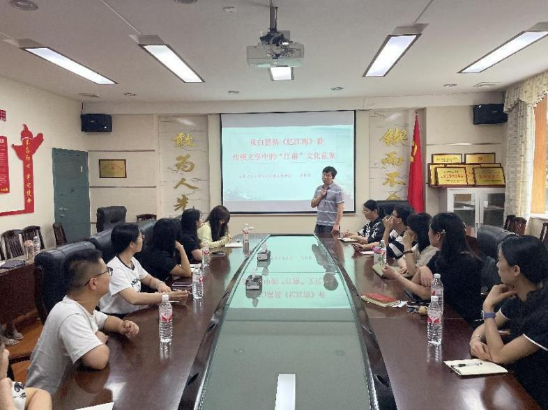 会上,唐林轩作《从白居易〈忆江南〉看传统文学中的“江南”文化意象》的说课展示,他以唐、五代中的江南意象为内容,强调了教学竞赛中构建情景导入设置、课件风格设置以及课堂互动机制的必要性。唐林轩创造性地在课堂上带领学生以谣唱的方式学习古诗词,使整个教学展示变得生动而富有意境美。